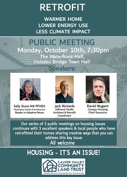 You are welcome to join us from 6pm to take a look at the historic Fielden Hall and learn more about how this important community asset is now managed and used. You’ll also have the opportunity to talk to Paul and Dai from the Calder Valley Community Land Trust about the current retrofit project taking place at the Hall. The project is forecast to reduce energy bills by 41% and CO2 emissions by 87%. Talk to the Fielden Centre Association about the history of Fielden Hall. Talk to our trustees about the enterprise centre and housing project at Ferney Lee.
