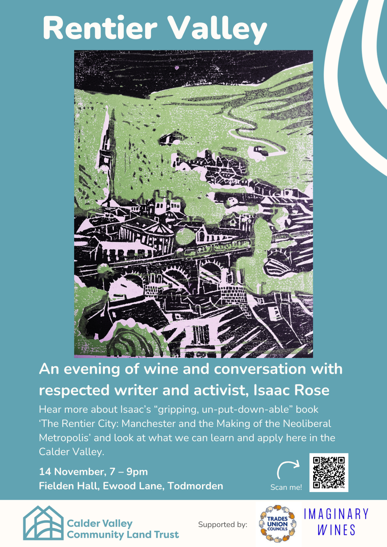 In a conversation with Isaac and Dan Whittall from the Trades Union Council, we’ll look at what we can learn from Manchester and what solutions we can apply here in the Calder Valley. The discussion will be facilitated by Incredible Edible’s Pam Warhurst.